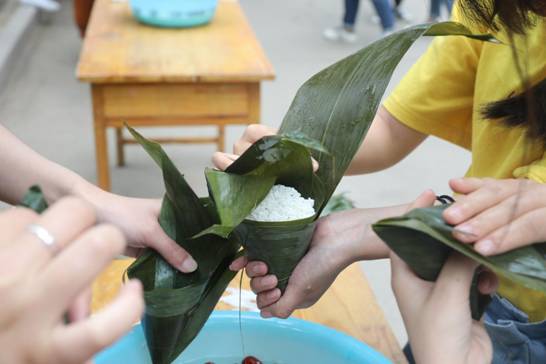 这方新手手忙脚乱,拿着粽叶,努力回忆包粽子教程,向左折,向右翻,要么粽叶不够长,要么粽角上漏米。那方老手手到擒来,拿起粽叶,利落翻折、填米、放枣、压实、包裹、缠线一套动作搞不拖沓,粽叶也老老实实“任其摆布”。有的同学说,脑中分明构好图了,手却老是不配合,粽叶就是不听使唤。有同学说,自己去年就有实践经验,今年要包出“美粽子”不在话下。几位有过包粽子经验的老师亲自出马,手把手的教,现场新手请教老手,老手虚心授教,每个桌子俨然都成立了一支老带新的包粽子小队伍。