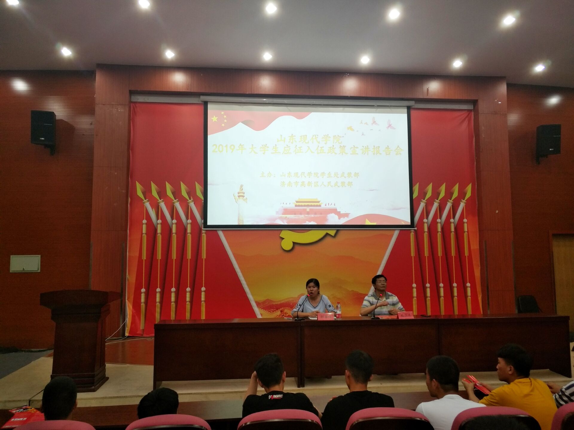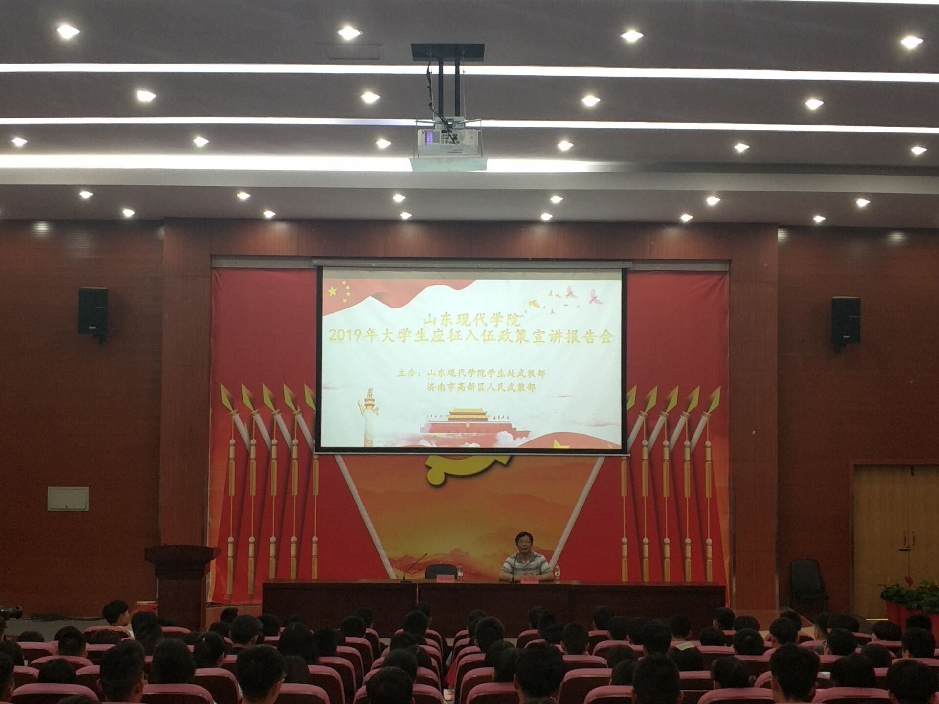 我院于2019年6月12日下午2点,在科研楼101召开“2019年大学生应征入伍政策宣讲报告会”。会议由学生处副处长邵鲁琳主持,济南市高新区人民武装部征兵办公室主任赵卫东主讲,本次宣讲主要从党和国家(政策和态度)、国防建设、鼓励参军这三个方面展开。