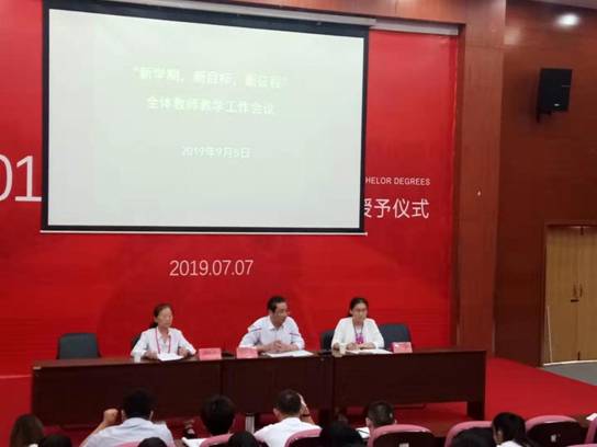 2019年9月5日下午14:30在科研楼101室,由教务处统筹组织召开“新学期 新目标 新征程”全体教师教学工作会议,本次会议由学院副院长王开贞主持,教务处处长杨秀、副处长刘传琴及全体教学管理干部和老师参加。