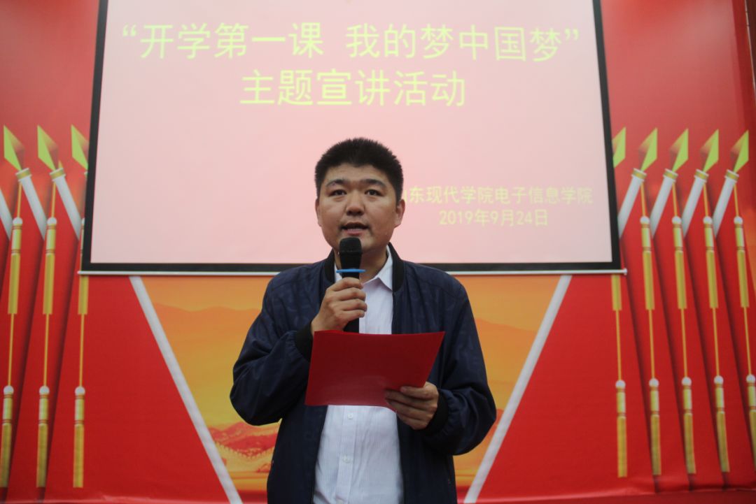 在祖国母亲七十华诞之际,为弘扬和传承爱国主义精神,激发新时代大学生的担当精神与责任意识,引导学生树立正确的理想信念和价值观念,由共青团山东现代学院委员会主办,电子信息学院学生会承办的“我的梦,中国梦”宣讲活动于9月23日晚七点半在科研楼101报告厅举行。莅临本次活动的领导及嘉宾有:学生处副处长李秀彬,电子信息学常务副院长邵大勇,各二级学院教师代表及学生代表。