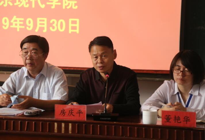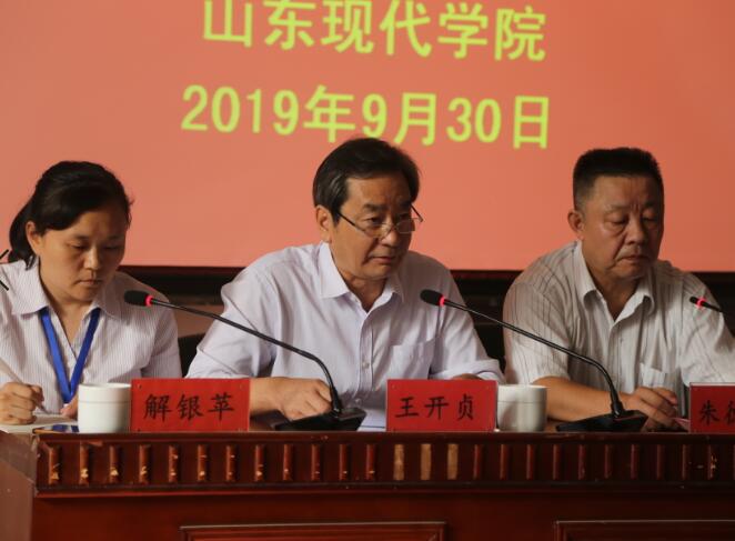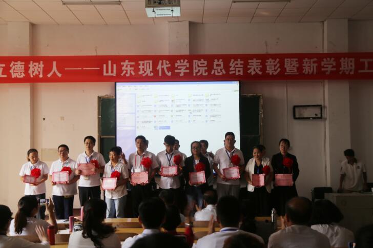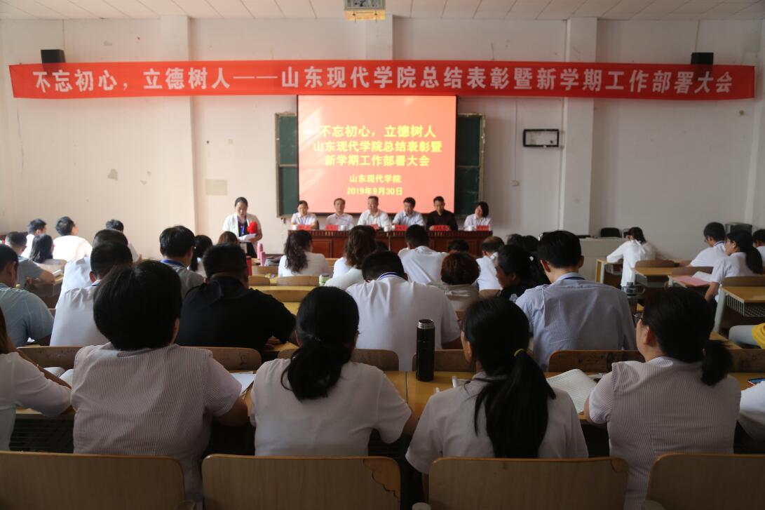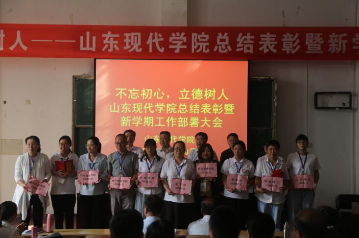 为总结2018-2019学年第二学期工作,振奋精神,提升斗志,开拓进取,以崭新的风貌迎接建国70周年,我院于阶梯教室108召开“不忘初心,立德树人-山东现代学院总结表彰暨新学期工作部署大会”,党委书记朱德强、副院长帅相志、王开贞、房庆平、院长助理李泉慧、解银苹、董艳华、车海燕、宋国增、吴启军出席,大会由朱德强书记主持,全体干部、教职工参加。
