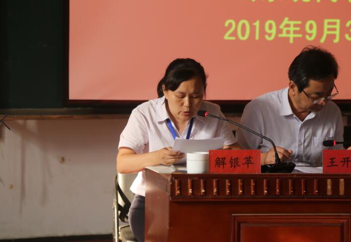 第八项,院长助理解银苹宣读刘春静董事长重要讲话,董事长对获得表彰的单位和个人表示祝贺,在建国70周年之际,号召全体教职员工振奋精神,爱国爱校、不忘初心、立德树人,并提出三点要求:第一,进德修业,常怀感恩之心;第二,牢记 “天道酬勤”的校训,做新时代的奋斗者。第三,关爱学子、精心育人。希望全院上下以习总书记的讲话精神为旗帜,坚持以“提升内涵”为目标,以“立德树人”为根本,以教学为中心,不断提高教育教学水平,快乐工作,幸福生活,共创和谐美好现代。