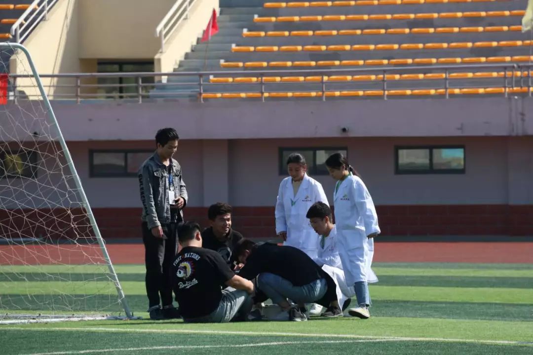 场上的另一番风景是那些“陌生的面孔,熟悉的笑容”——针灸推拿协会的志愿者们,他们统一着装,刻苦服务,在如此寒冷的天气下为本次足球联赛保驾护航,充分展示了医学风采。