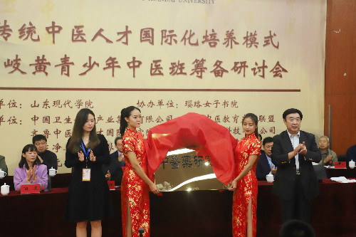 副院长帅相志教授和学院董事会执行董事、董事长助理李泉慧同志为山东现代学院中医研究院揭牌。