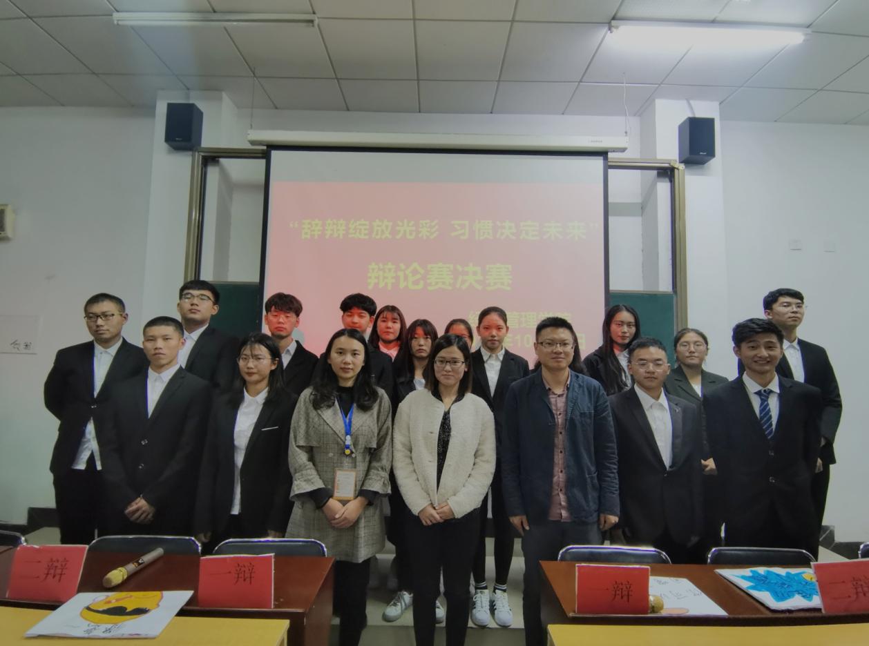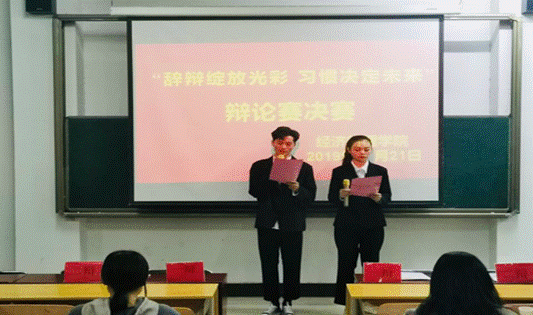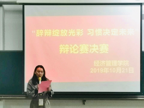 为丰富同学课余生活,活跃校园气氛,开拓同学思路,体现大学生风华正茂的精神状态,提高同学辩论水平,发掘培养辩论人才。经济管理学院于2019年10月21日晚,在合堂208教室举办以“辞辩绽放光彩,习惯决定未来”为主题的辩论赛决赛。此次大赛特邀经济管理学院学生会基层团委书记石颖老师,辅导员金福刚老师,曹显老师,以及经济管理学院学生会部分干部出席。