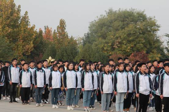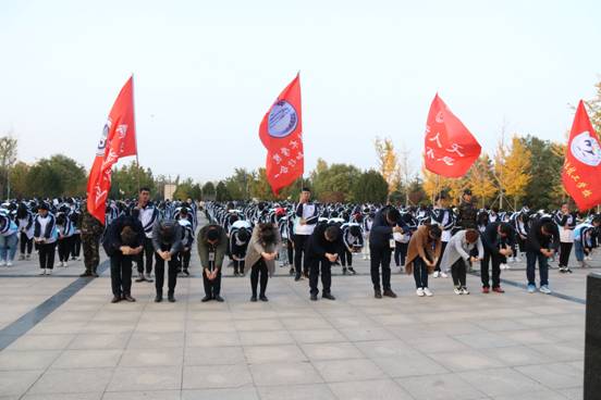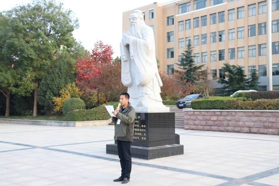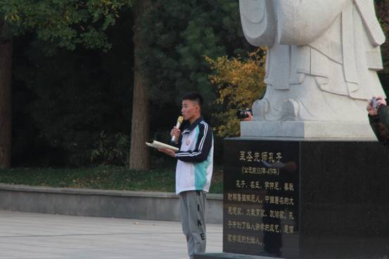 随后,五年大专部马强老师带领全体师生行拜圣礼(肃立,拱手,高揖,为天地立心,为生民立命,为往圣继绝学,为万世开太平),古代先贤孔子雕塑前,1000余名师生动作整齐、娴熟,场面非常的壮观。礼毕,接下来千人诵读《弟子规》,“弟子规、圣人训………朗朗诵读声响彻弥漫在整个校园,异常震撼,肃然起敬的心绪油然而生,伴着金秋落叶,让我们感受到了浓厚的书香氛围和悠远的意境。