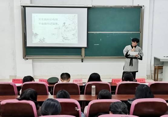 首先李静同学为大家带来诗词《声声慢·寻寻觅觅》。她结合词人的不幸经历,将本词中的凄苦悲凉剖析透彻,令观众对本词有了不一样的感悟。画风一变,薛亚超为同学们鉴赏李白的《将进酒》。他的鉴赏展示了李白既无奈又豪放洒脱的一面,他独特的方式让评委眼前一亮。当观众们对李白的遭遇还意犹未尽时,孟祥瑞同学同样选择赏析李白的诗歌——《宣州谢朓楼饯别校书叔云》,她用诗意的文字带领观众进入诗中的意境,引得观众掌声连连。