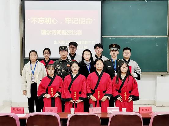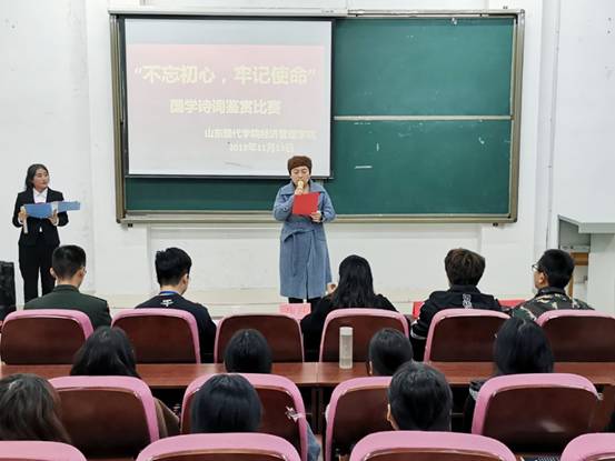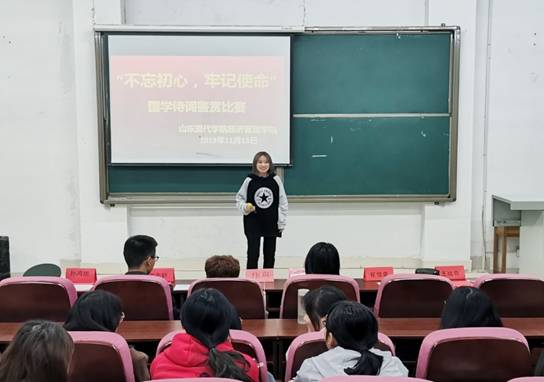 为丰富校园文化生活,激发学生的读书和诵读热情,营造浓厚书香校园氛围,传承国学文化经典,经济管理学院于2019年11月13日晚七点,在大学生活动中心112教室举办以“不忘初心,牢记使命”为主题的国学诗词鉴赏比赛。本次比赛特邀经济管理学院常务副院长康惠院长、基层团委书记石颖老师、学生会副书记李雨轩、主席王战奇、崔俊豪、孙鸿旭出席。