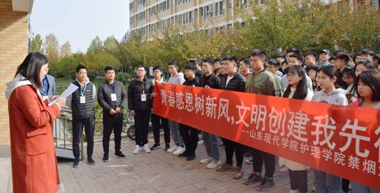 护理学院于11月7号下午在11号楼举办了“青春感恩树新风,文明创建我先行”禁烟活动。护理学院各辅导员老师身体力行带领各班级同学参加,在13号楼手提垃圾袋等卫生工具,徒手对草坪中的烟头、烟盒等垃圾进行收集处理,活动过程中主动帮助清洁工阿姨整理可回收废旧物品。