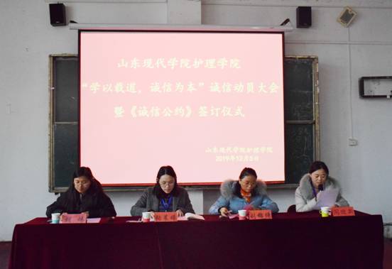 期末考试将近,为加强学院考风建设,严肃考纪,营造良好的考试氛围,护理学院于12月5日在合堂108举办“学以载道,诚信为本”诚信动员大会暨《诚信公约》签订仪式。本次签订仪式由行政秘书闫迎新老师主持,护理学院常务副院长刘锦绣,办公室主任张晨曦以及行政秘书助理胡炜出席本次签订仪式。