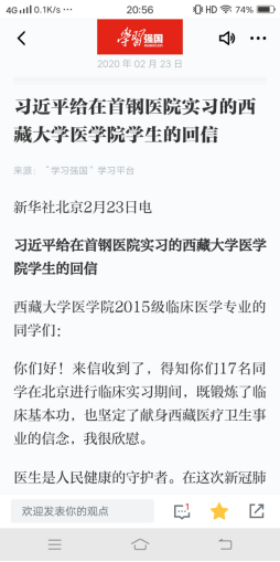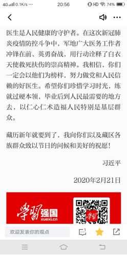2月21日习近平总书记给正在北京大学首钢医院实习的西藏大学医学院学生回信,肯定他们献身西藏医疗卫生事业的志向,勉励他们练就过硬本领、服务基层人民,并向他们以及藏区各族群众致以节日的问候和美好的祝愿。习近平总书记的回信体现了党中央对医务工作者和少数民族群众的关心与关爱,激发了广大青年学子和各行各业劳动者以抗击疫情的白衣天使为榜样,将奋斗成果写在祖国大地上的决心。