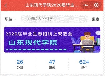 为最大限度额降低疫情对我校毕业生就业的影响,学院与多家网络平台合作,开展线上招聘活动,其中,与校友邦平台在2020年3月15日—4月10日期间,举办了“山东现代学院2020年春季网络校园招聘会”。截至目前山东招聘专场200余家单位,提供工作岗位4000余岗位,参与线上宣讲企业有:鲁抗医药、学而思济南、国子软件、开创集团等。
