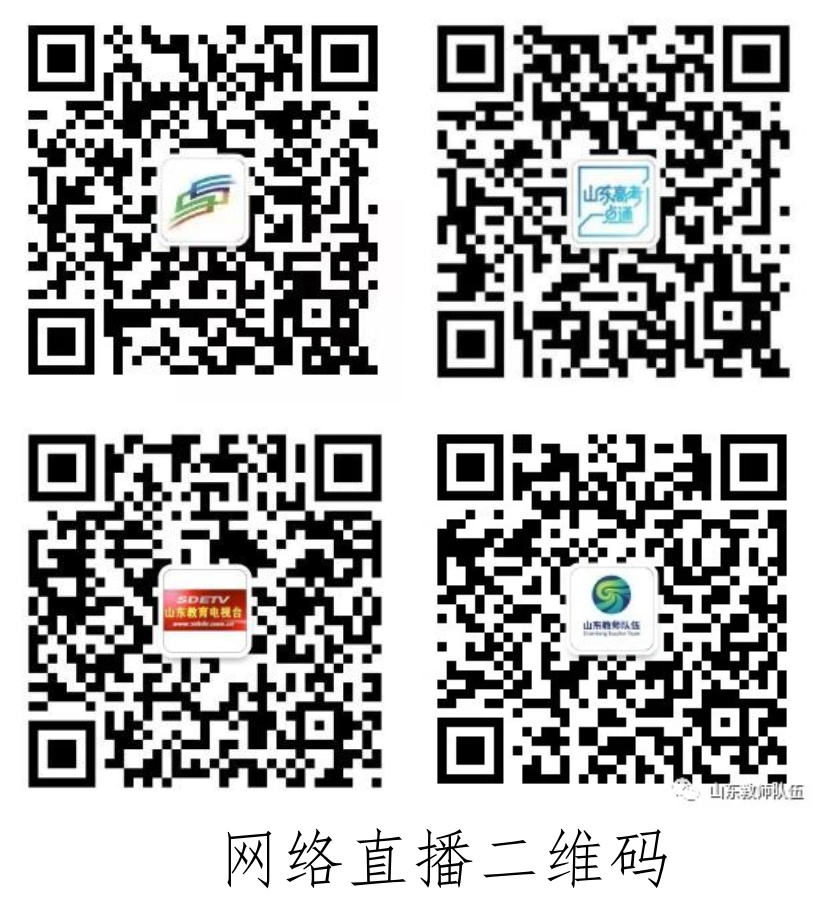 (二)网络端:通过扫描以下二维码,进入“山东教育发布”“山东教育电视台”、“山东高考一通”或“山东教师队伍”微信公众号,在“活动 互动”中,打开“同心战疫特别节目”观看。
