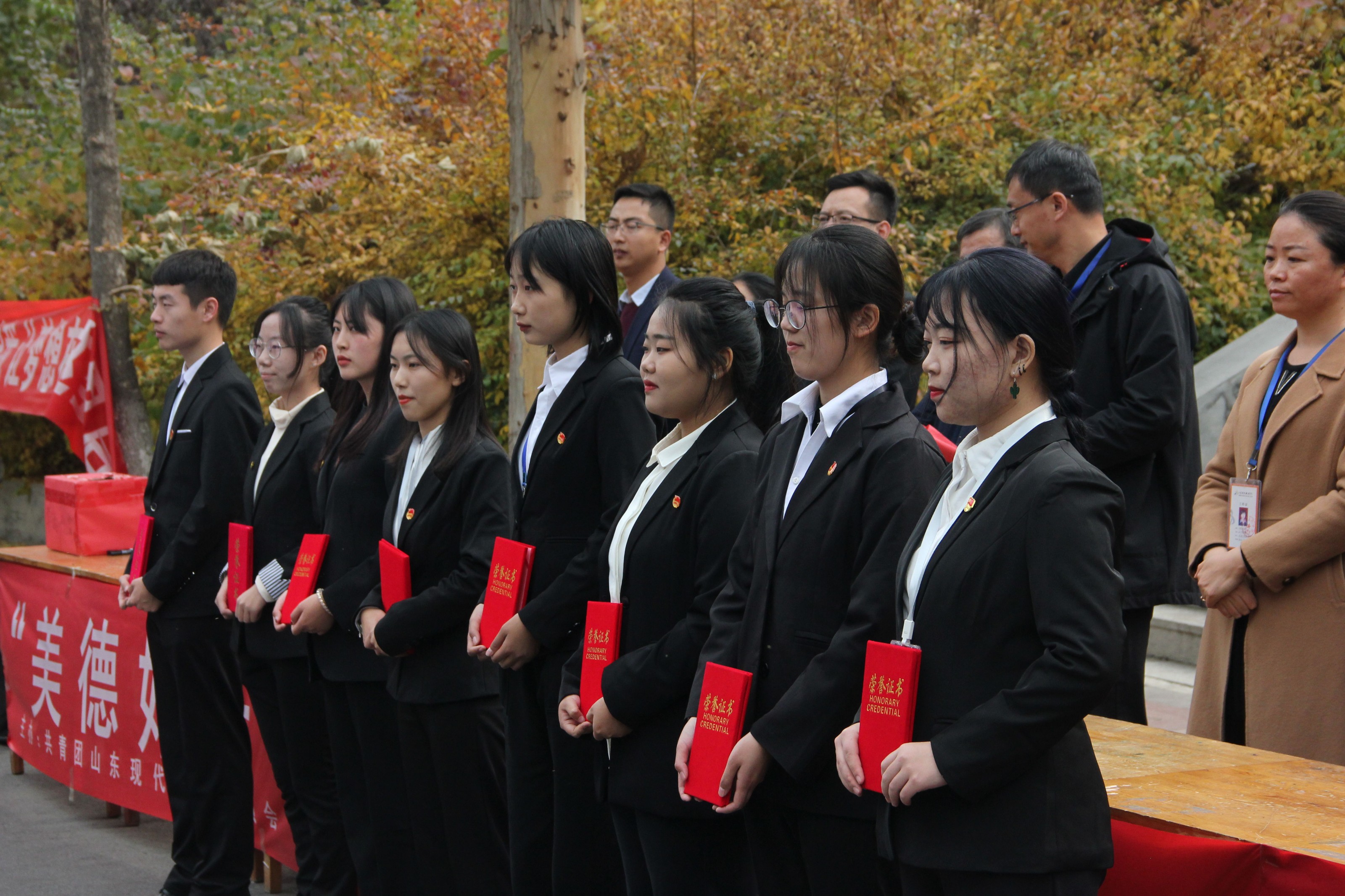 现场学管干部为在光盘行动中表现优异的学子颁发证书。