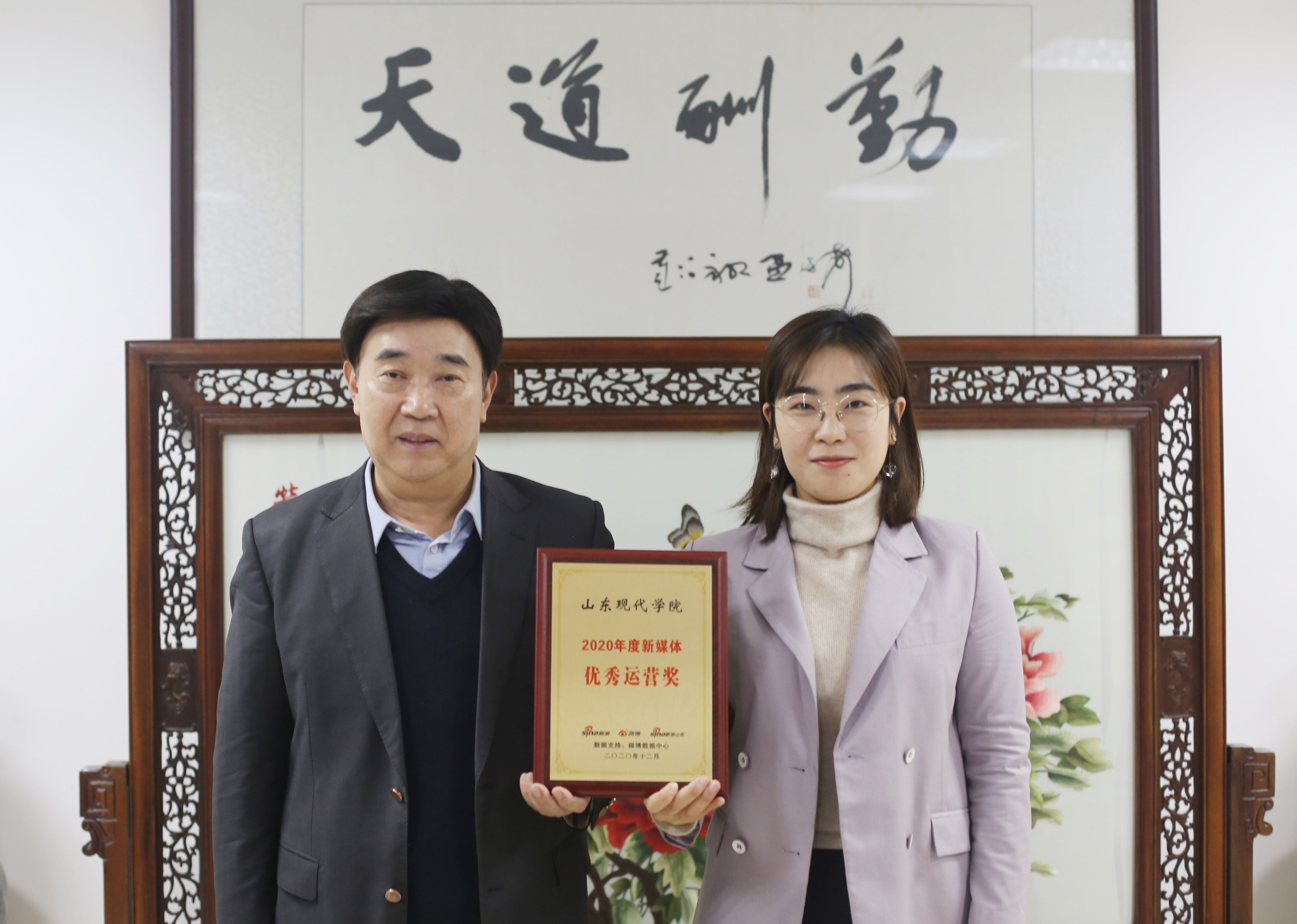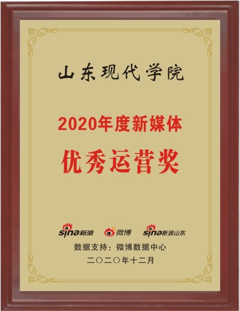 近日,2020年度山东教育盛典荣耀榜单盛大发布,我校荣膺2020年度山东最具行业影响力本科院校、2020年度新媒体优秀运营奖两大奖项。新浪山东记者程冉来校颁奖,常务副院长帅相志教授代表学校接受奖牌。