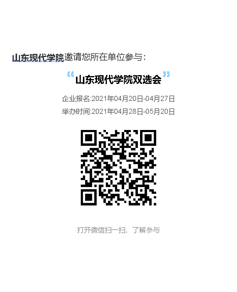 为全面贯彻落实省人社厅,教育厅和学校在新型冠状病毒肺炎疫情防控期间对毕业生就业工作的决定部署和工作要求,在保护好毕业生生命健康安全的同时,最大限度降低疫情对毕业生就业的影响,实现稳定就业,我校将联合校友邦平台举办山东现代学院2021届毕业生春季网络招聘会,特邀贵单位洽谈和指导工作。现将有关事宜说明如下: