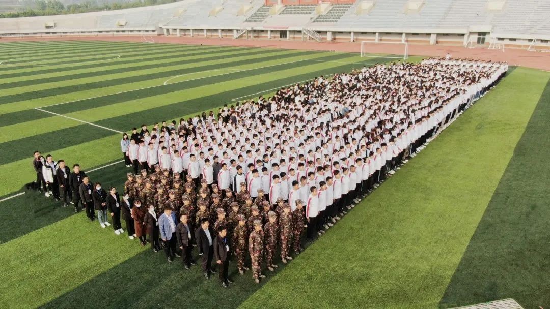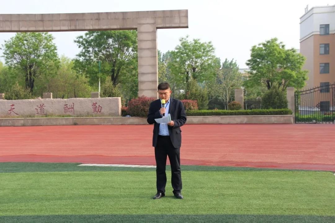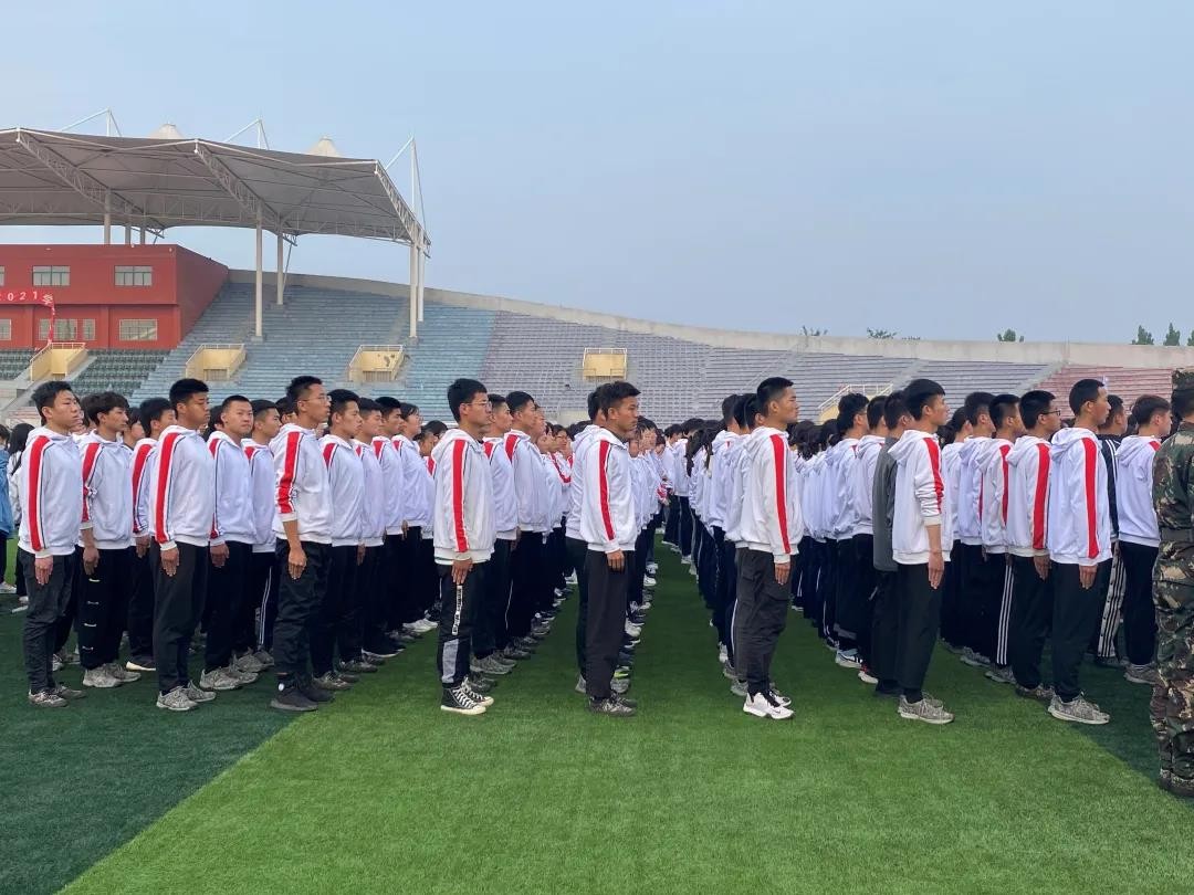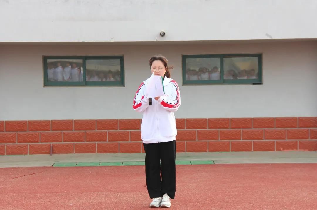 《义勇军进行曲》在新体育场上空响起,护旗手有力地挥出手中的国旗,全体师生目不转睛地注视着徐徐上升的国旗,齐声唱响国歌。