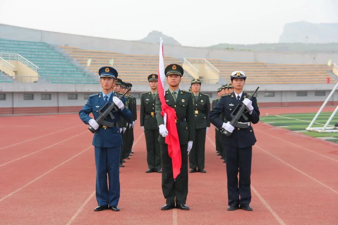 国旗护卫队步伐整齐、铿锵有力,身姿挺拔,庄严地护送着国旗入场。