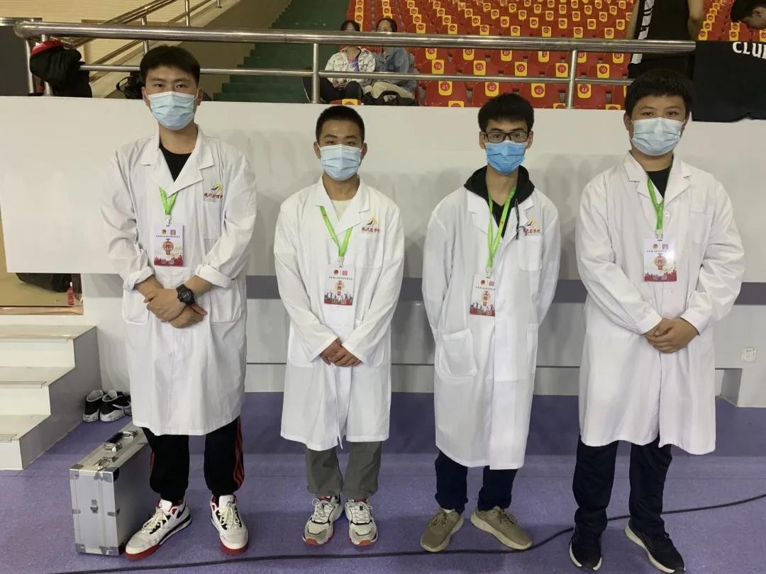 学生社团管理部派出了医疗小组,他们身披白色隔离衣,手持医疗箱为本次比赛参赛队员作出了安全的保障。