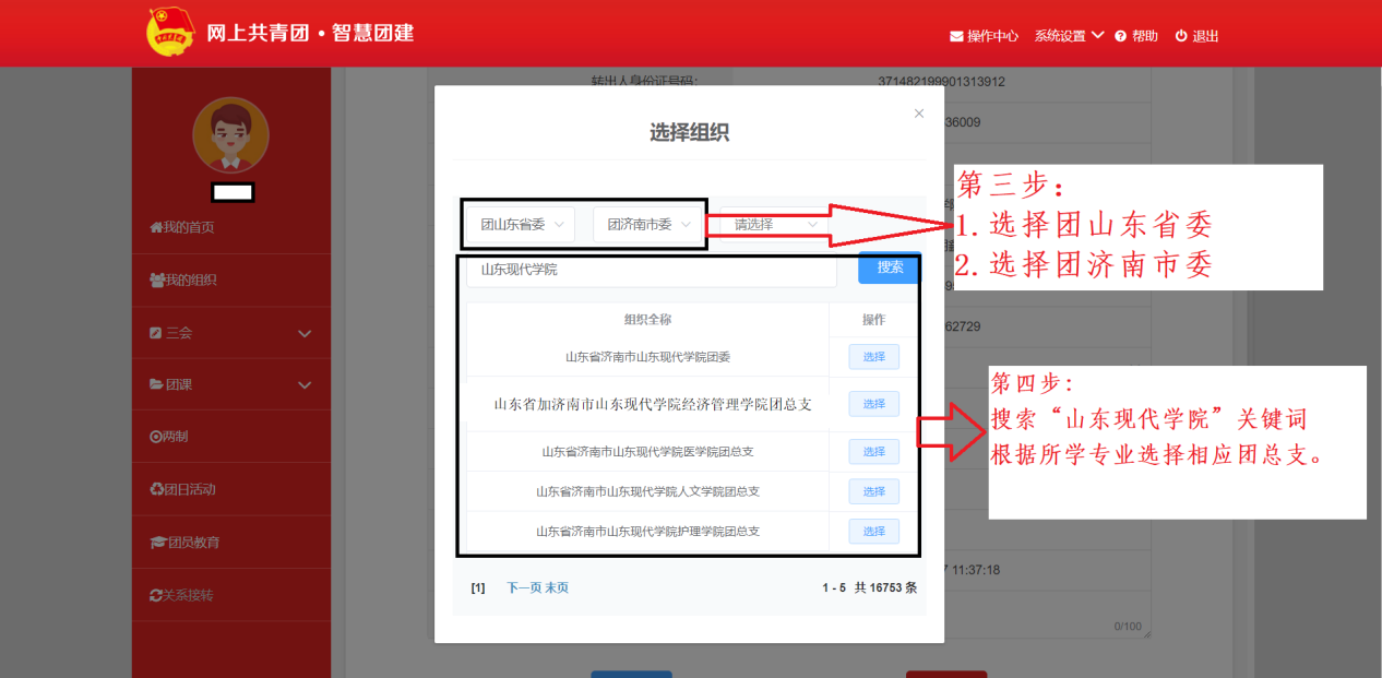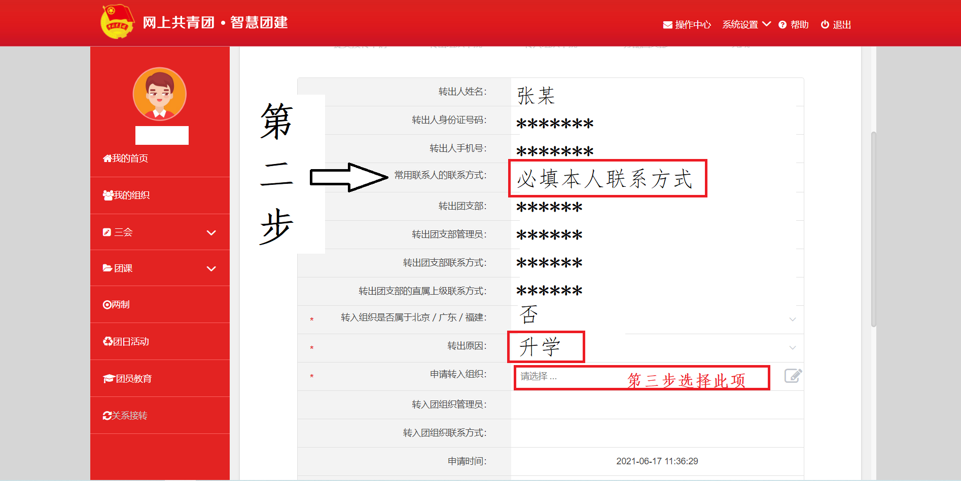 选定“申请加入组织(具体团总支)”后,转入团组织管理员、转入团联系方式为系统自动填入,按照要求填写好备注内容