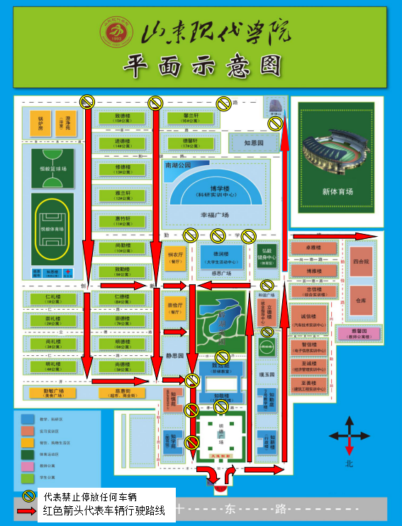 1.所有进校车辆一律遵循“西进、东出”原则;车辆进校后一律右转向西行驶,停车区域具体参见《山东现代学院新生报道期间校园停车示意图》(如下图所示),请各家长严格遵守停车规定。