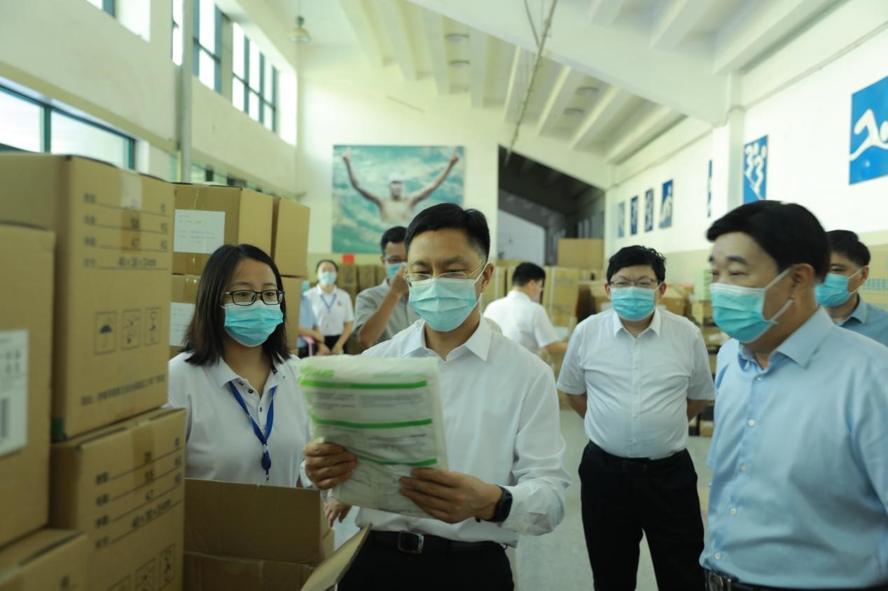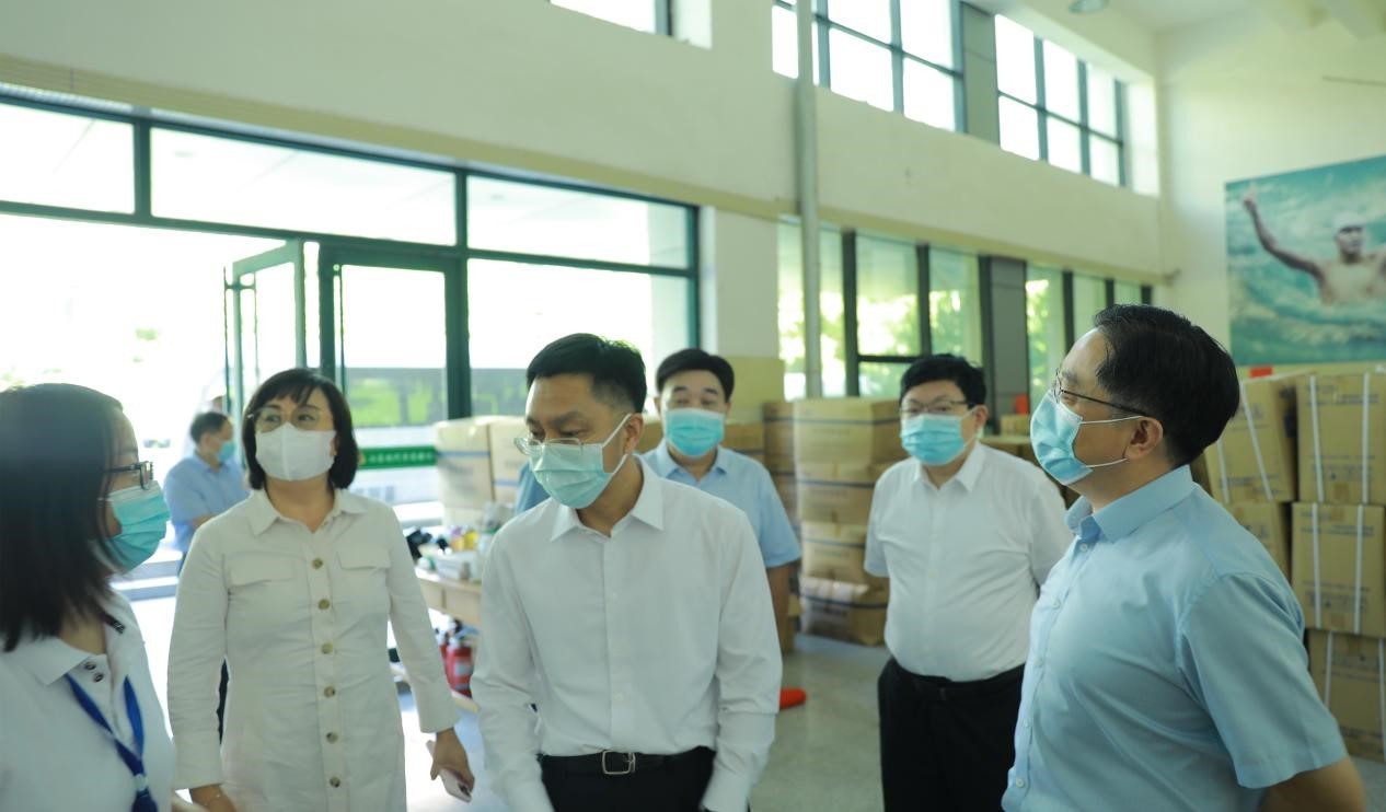然后,戴部长等领导分别检查了一号教学楼学生入门测温、教室防疫措施、学校监控室、医护实验室和物资储备仓库。各位领导对我校的常态化疫情防控和开学准备工作给予了充分的肯定。