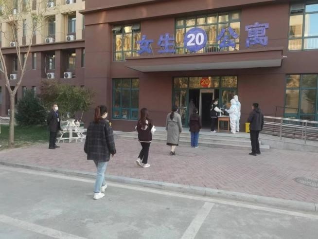 学生进入宿舍前自觉有序排队,前后距离一米进行体温检测并消毒,体温检测正常者方可进入,对体温异常学生进行登记并上报。