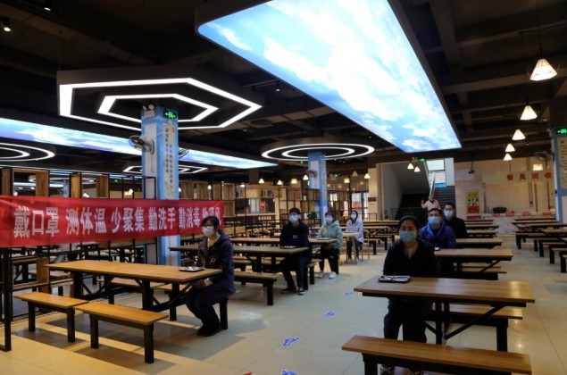 食堂出入口安排消毒和体温检测等程序,师生通过红外测温后,按照划定的红线排队打饭,错峰就餐。堂食时,严格保持一米以上的间隔,同向就座。