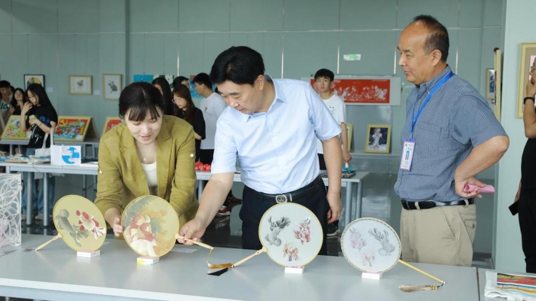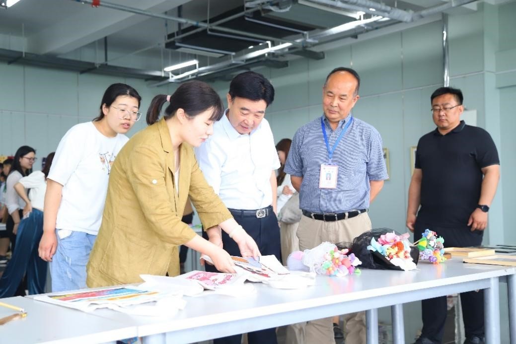 在人文学院讲解教师的引领下,与会领导、来宾和师生有序参观教学成果展作品。本次展出的每一件作品,都凝聚着现代师生的智慧和心血,充分展示了大家对生活的热爱和对艺术的追求。