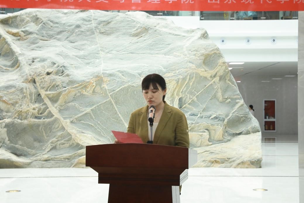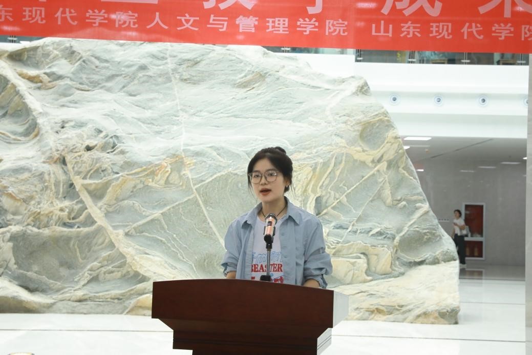 人文与管理学院院长李鹰教授介绍了本次展览的筹办情况,人文与管理学院学管就业副院长张靖麟、教师代表王冲、学生代表曹俞俞分别发表了热情洋溢的讲话,随后,徐兴余馆长宣布“迎校庆师生教学成果展”正式开始。