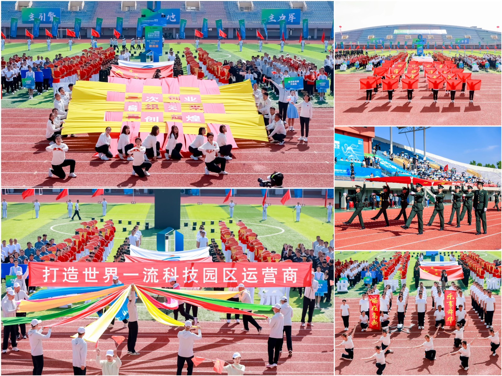 职工方队列队完毕,全场肃立,奏唱中华人民共和国国歌。党工委副书记、管委会副主任任广锋致开幕辞。