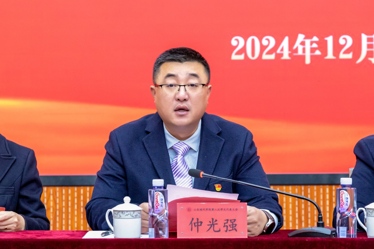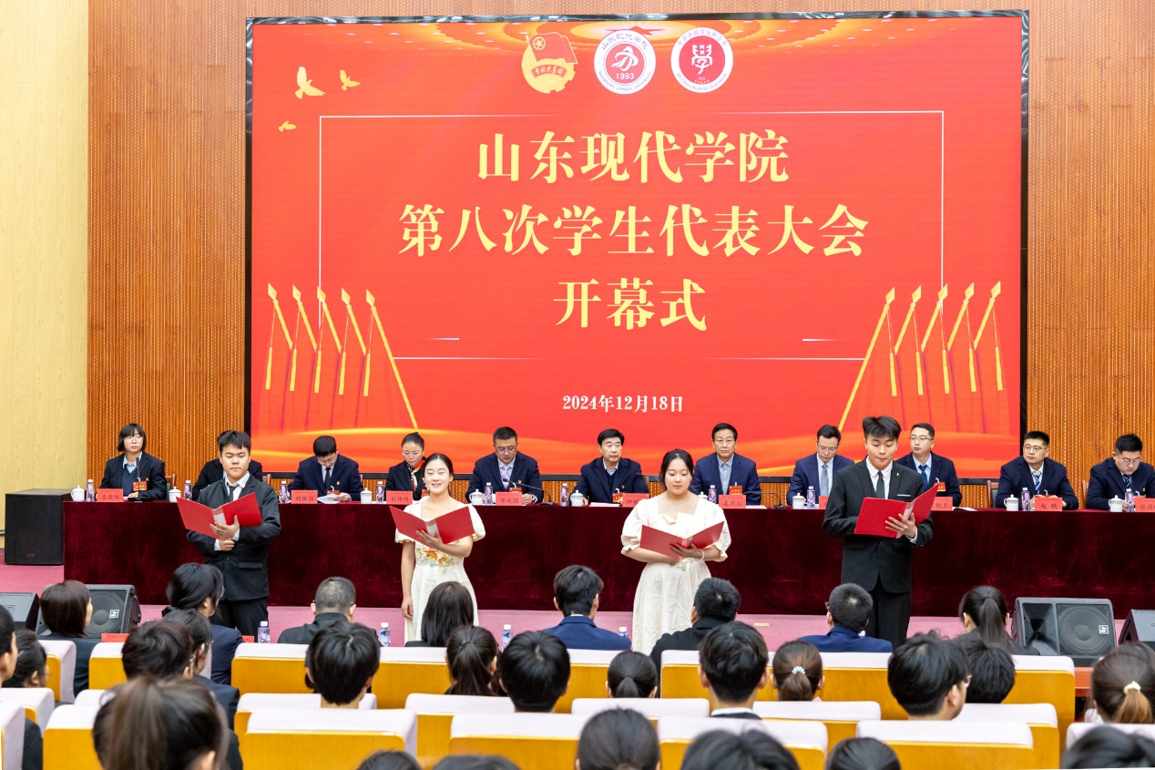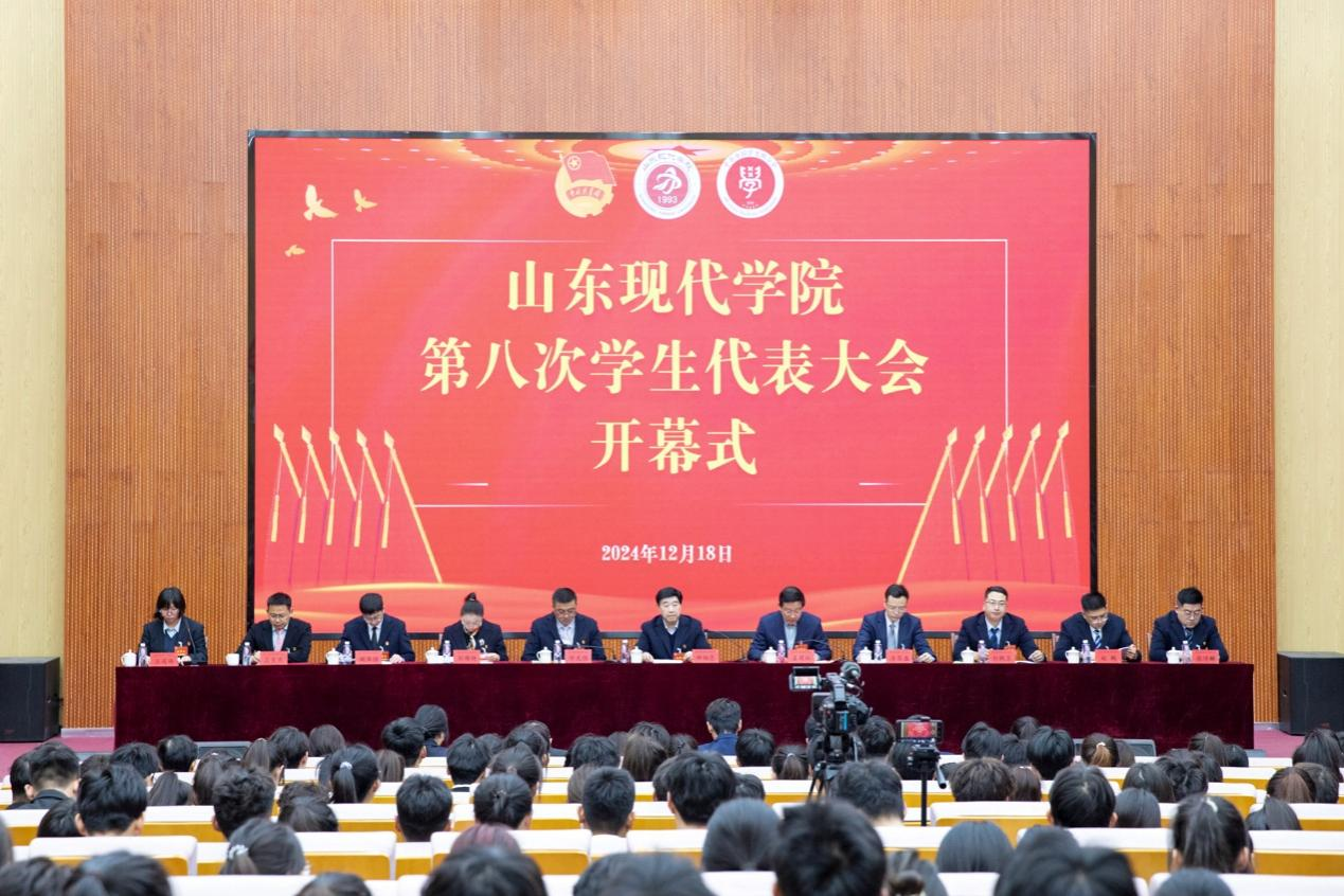 12月18日,山东现代学院第八次学生代表大会于图书馆报告厅顺利召开。校党委副书记、副校长帅相志,常务副校长姜同松,统战部部长仲光强,学生处党支部书记刘锦绣,各二级学院负责人、部分学团干部和332名正式代表参加大会开幕式。