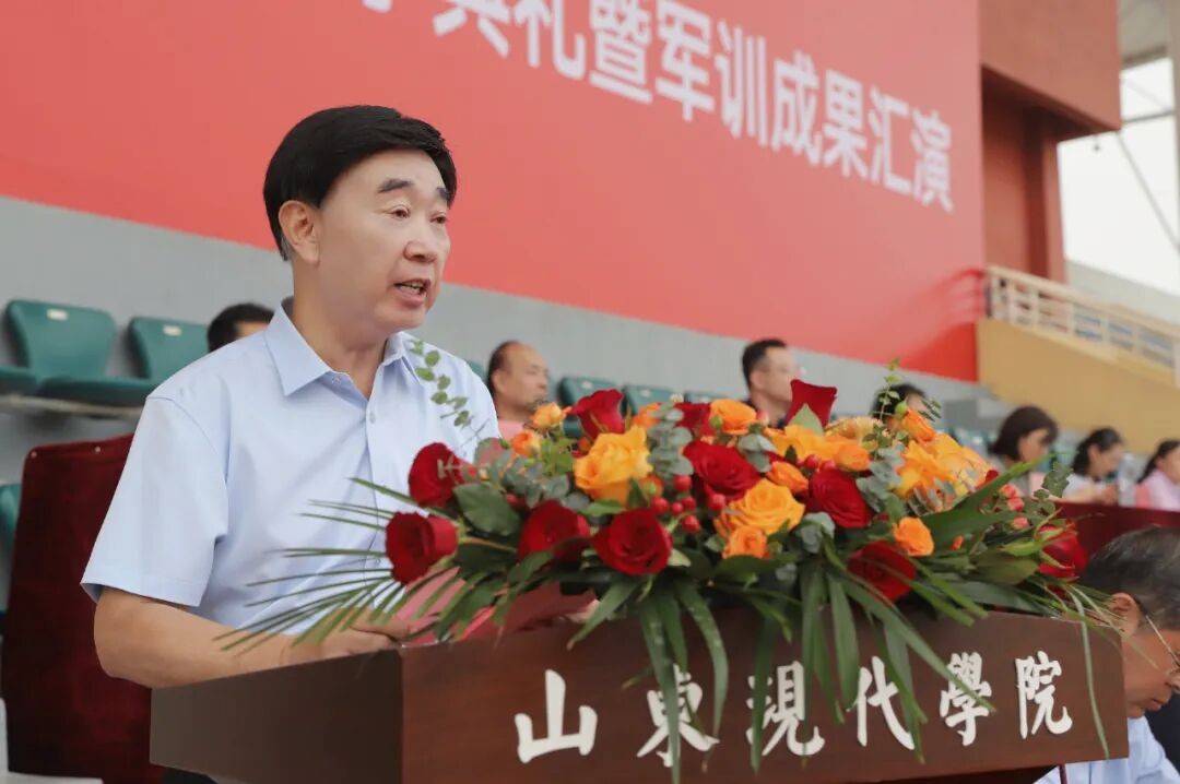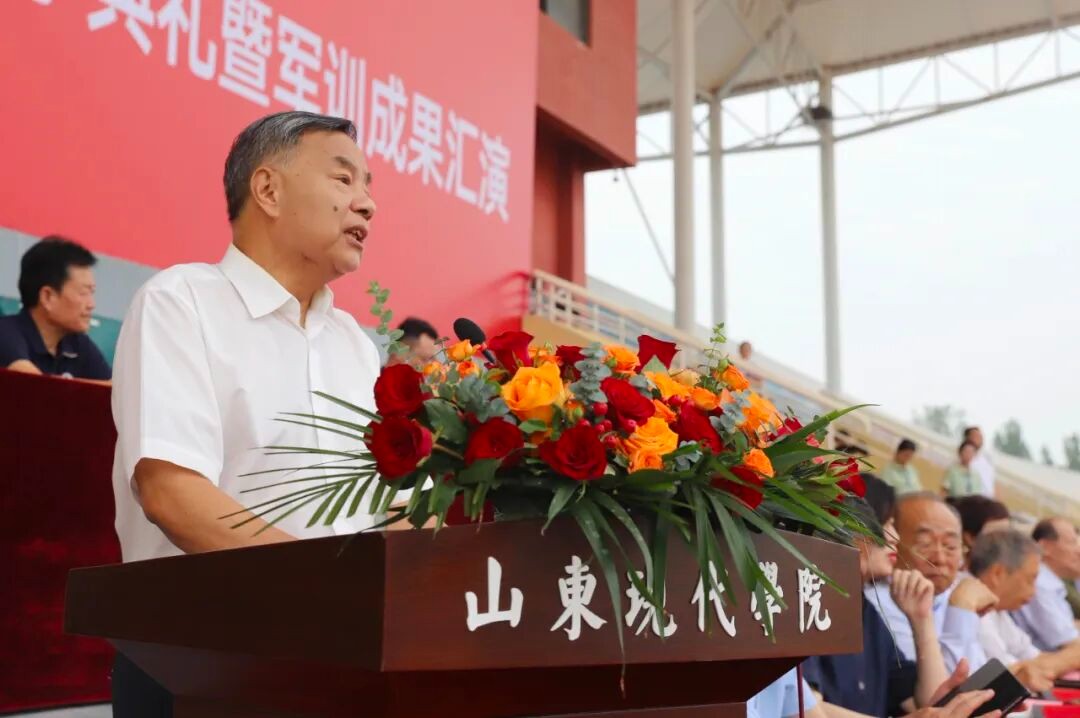 山东省政协原副主席、民进山东省委原主委栗甲致辞,他祝愿现代新生能以“厚德载物”的精神涵养品格,以“自强不息”的态度锤炼本领,努力成长为“有理想、敢担当、能吃苦、肯奋斗”的时代新人,为祖国的繁荣昌盛贡献力量。
