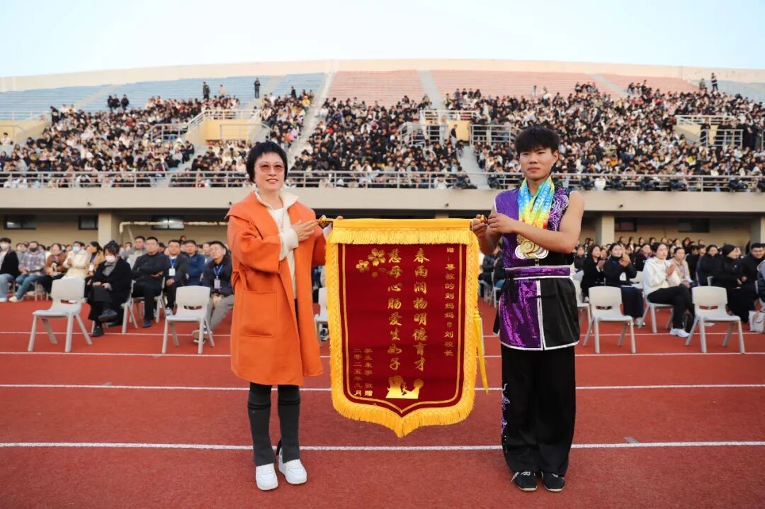 “春雨润物明德育才,慈母心肠爱生如子”。表演结束后,朱宇同学向董事长、校长刘春静敬赠锦旗,动情地表示:“董事长的鼓励,是我成长路上最温暖的力量,将永远激励我不断前行。”