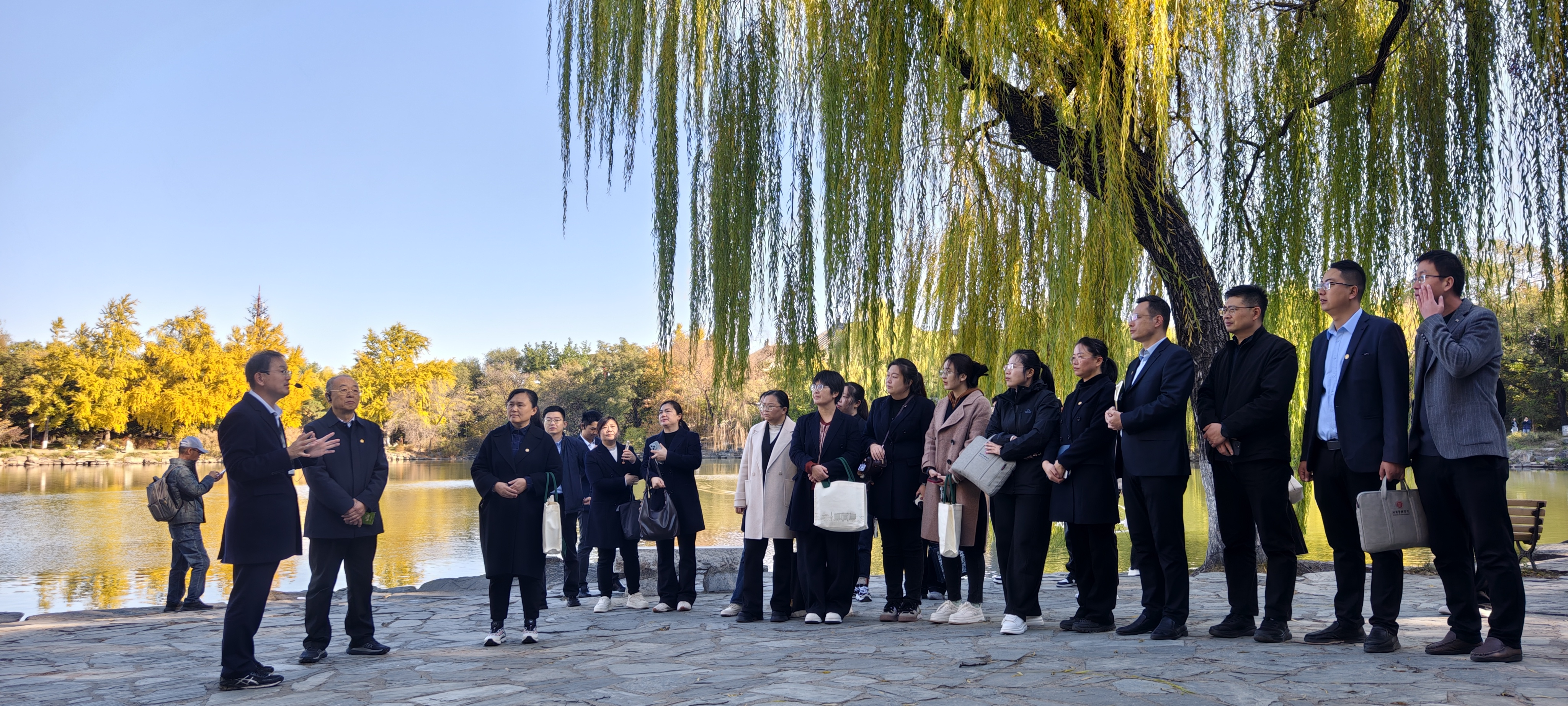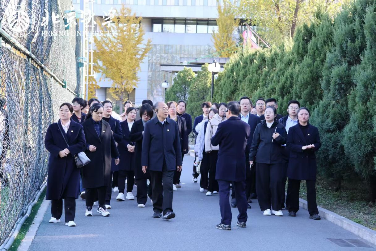 跟随着李主任的引导,教师们从政府管理学院出发,沿未名湖畔漫步。波光粼粼的湖面与巍然矗立的博雅塔,不仅是北大的地理标识,更是其精神象征。李主任生动讲解了“未名”的深意与“博雅”的内涵,阐述了“思想自由、兼容并包”的学术传统如何在此孕育生根。教师们在这幅绝美画卷中,切身感受着北大开放、包容的学术气质。