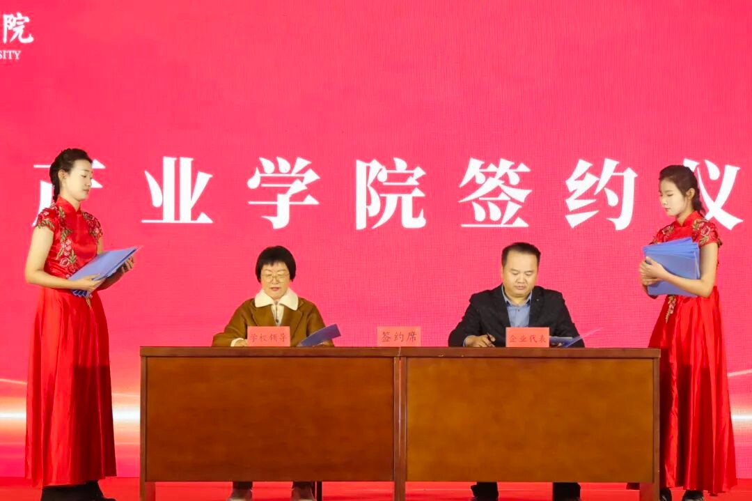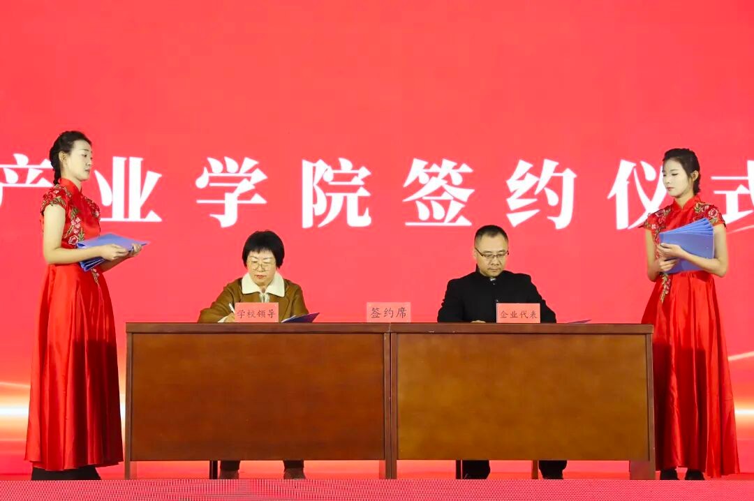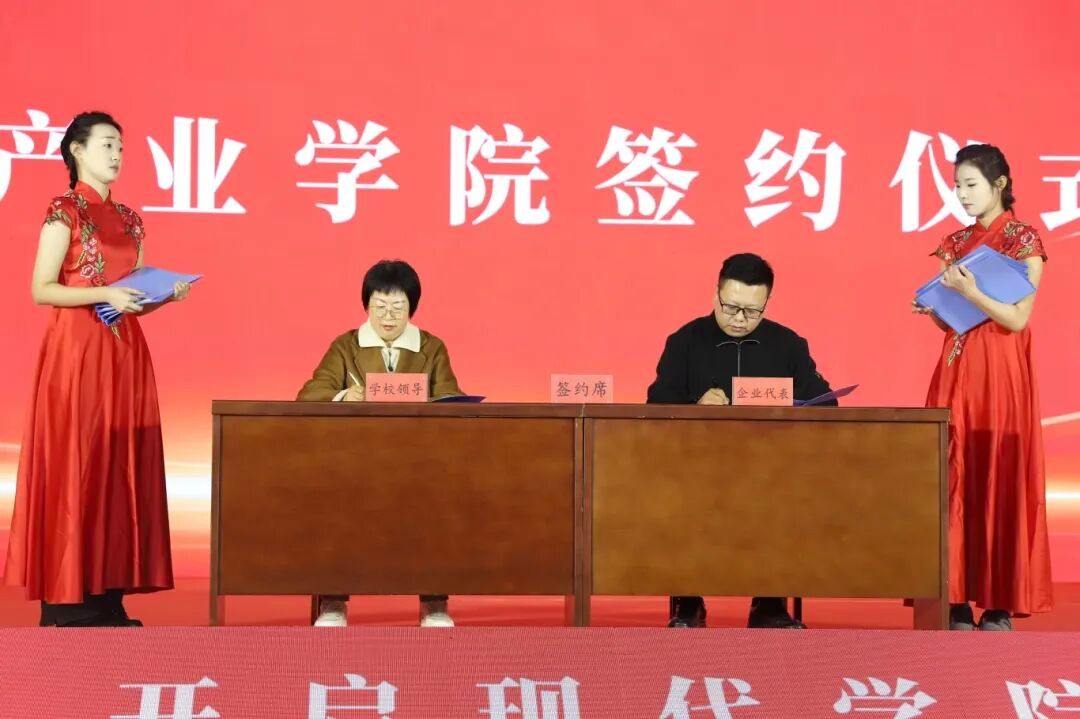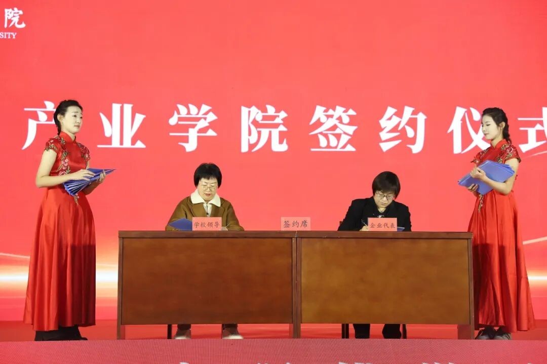 董事长、校长刘春静与山东开创集团股份有限公司、山东明仁福瑞达制药股份有限公司、漱玉平民大药房连锁股份有限公司、麦迪格眼科医院、山东秦老太食品有限公司、山东高盛物联科技集团有限公司代表签订了产业学院合作协议书。