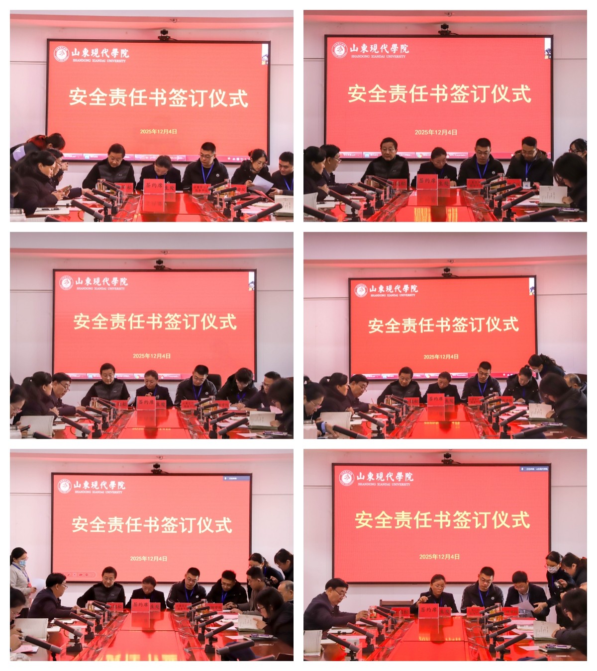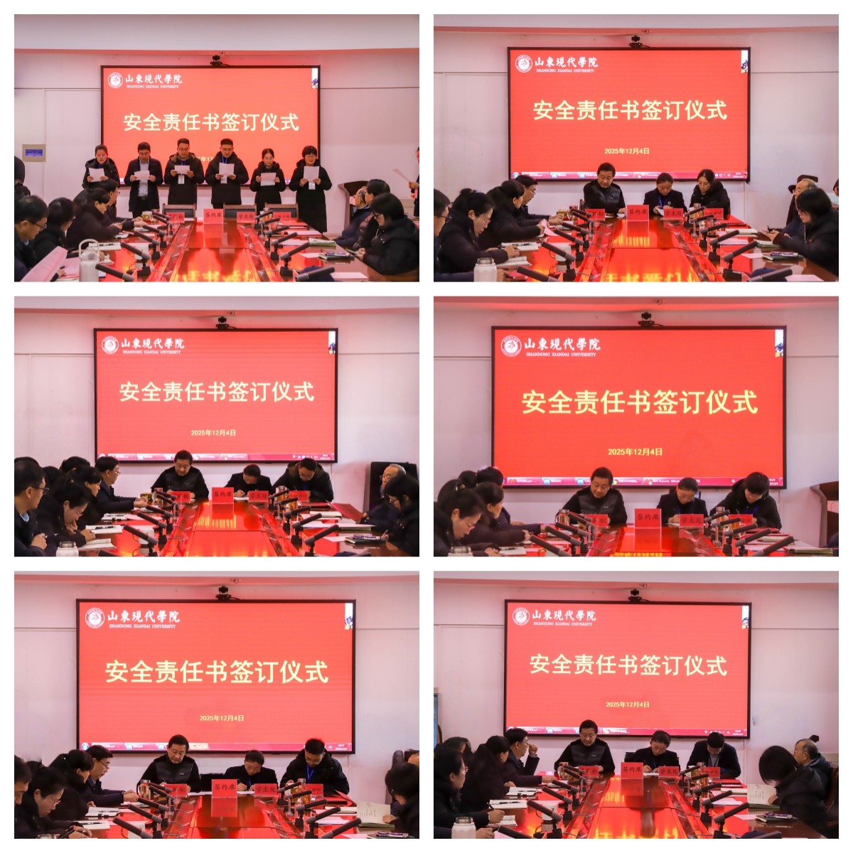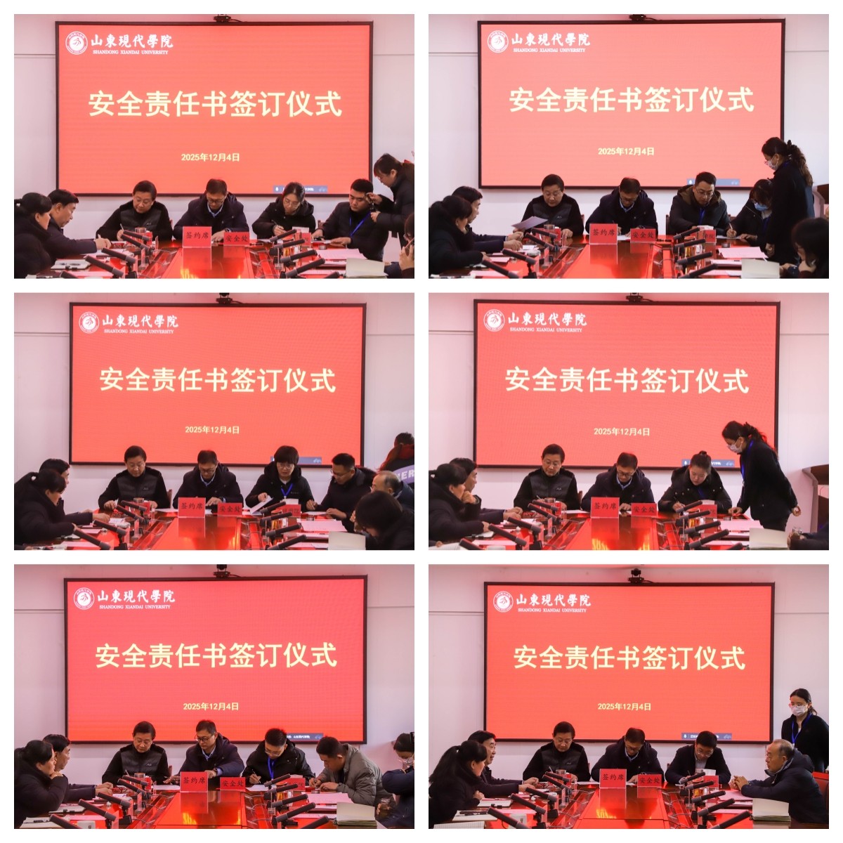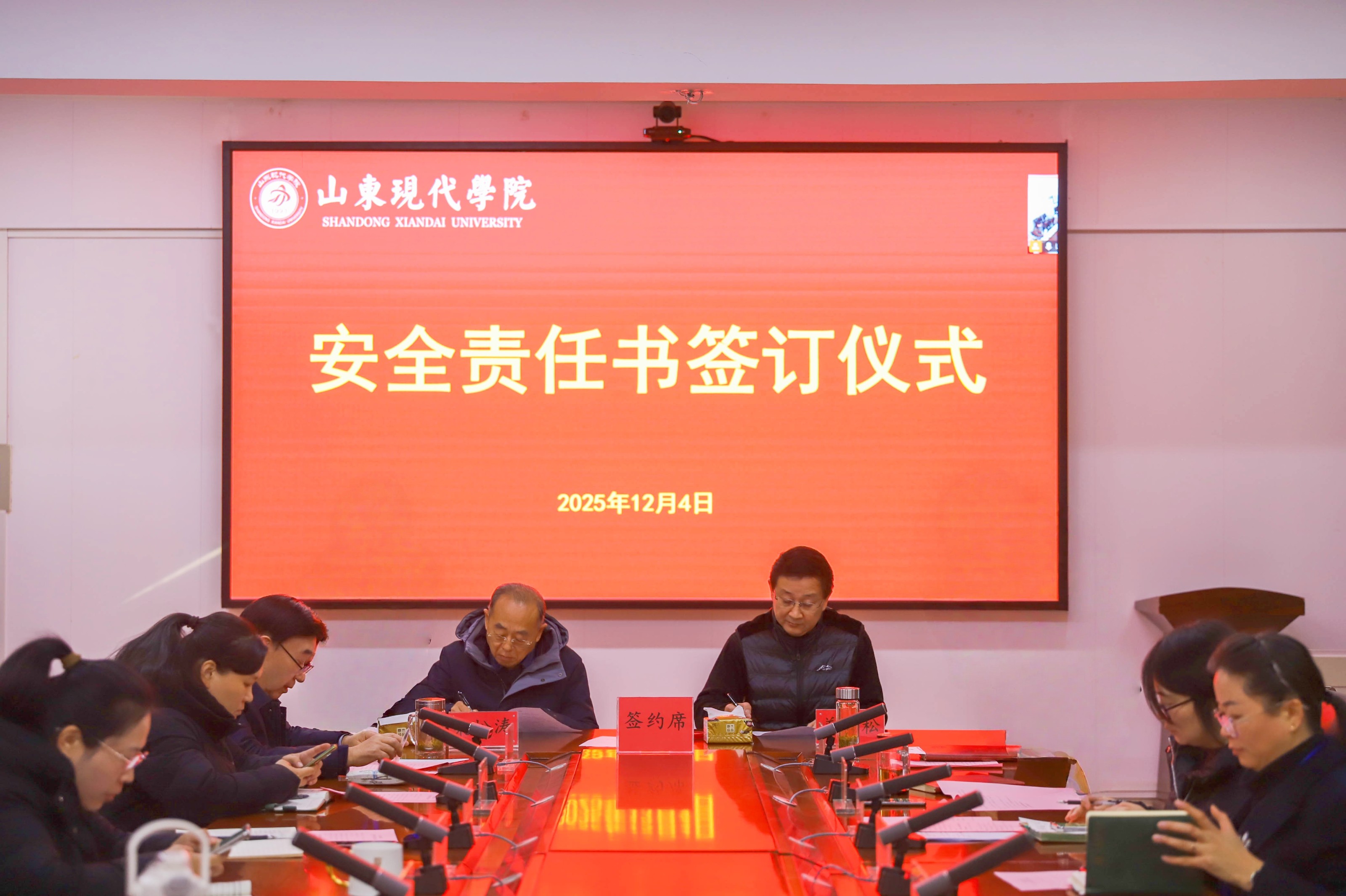 为加强校园安全管理,明确各岗位的安全职责,共同营造安全、和谐的校园环境,12月4日,学校举行安全责任书签订仪式,执行校长朱松涛、常务副校长姜同松、副校长解银苹,各教学单位、职能部门负责人参加会议,党委副书记、副校长帅相志主持签订仪式。