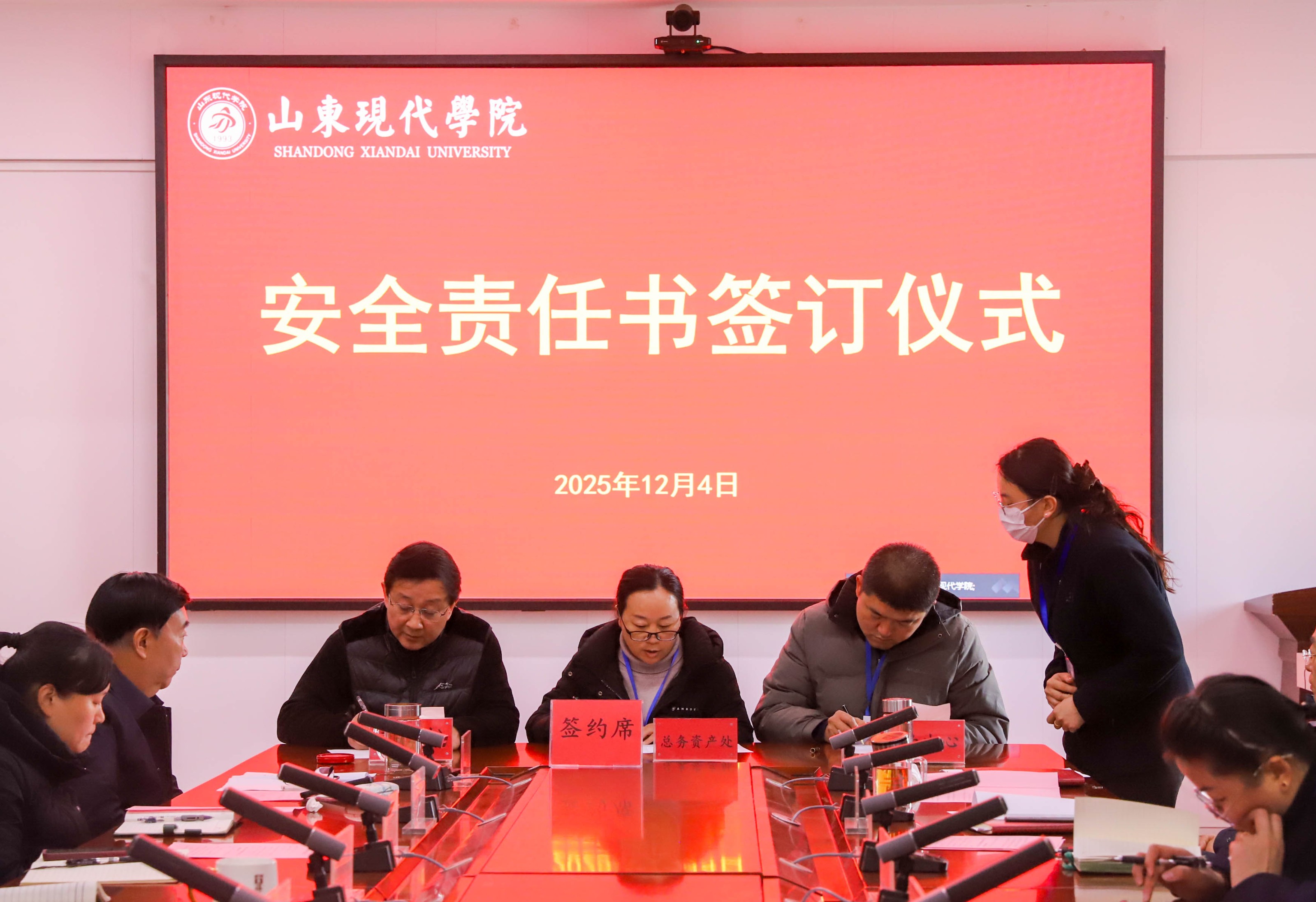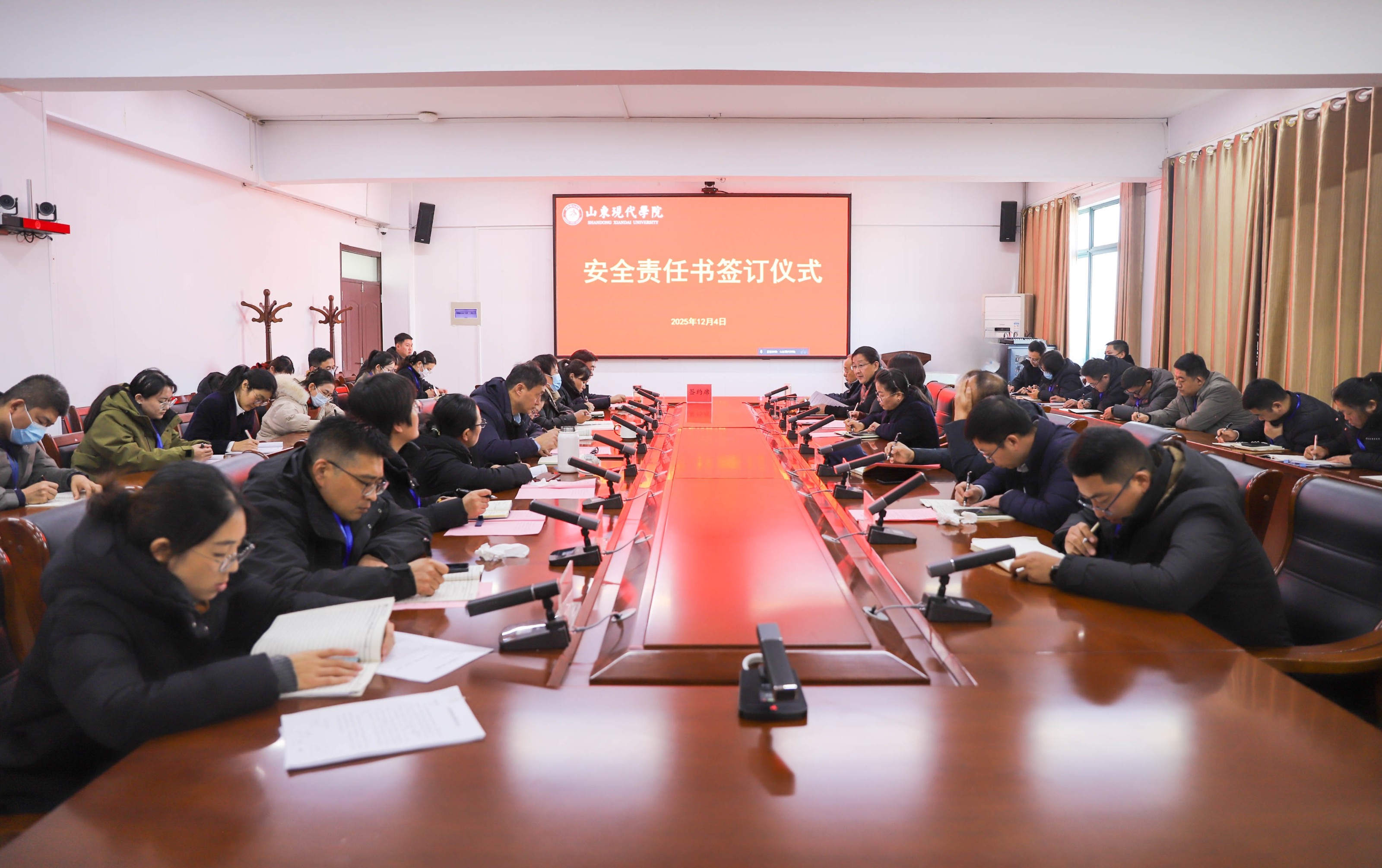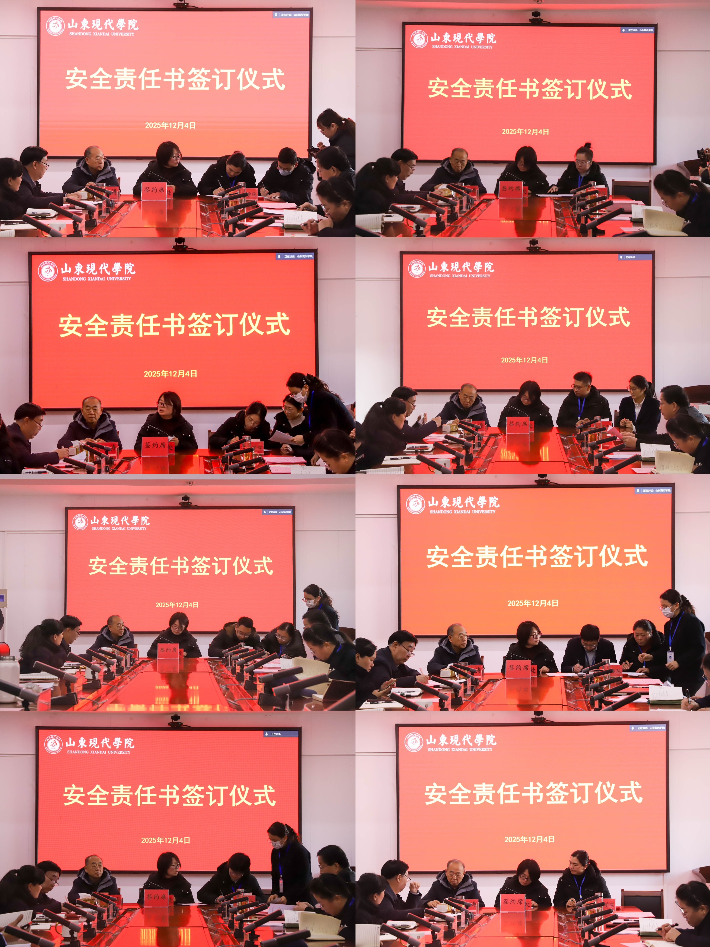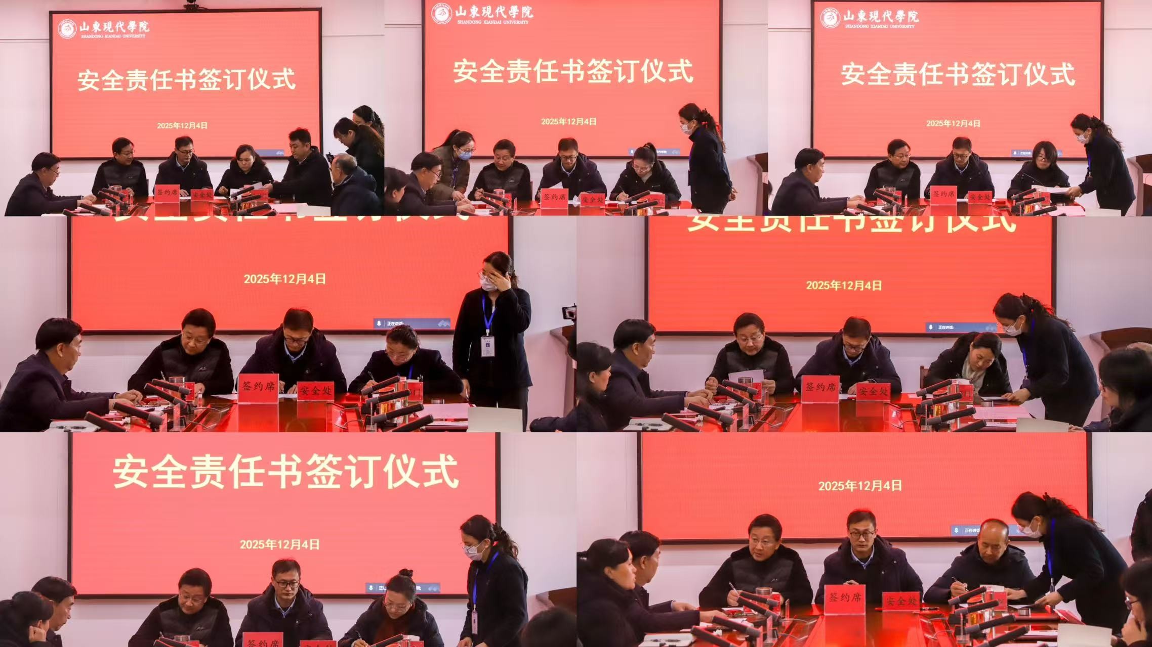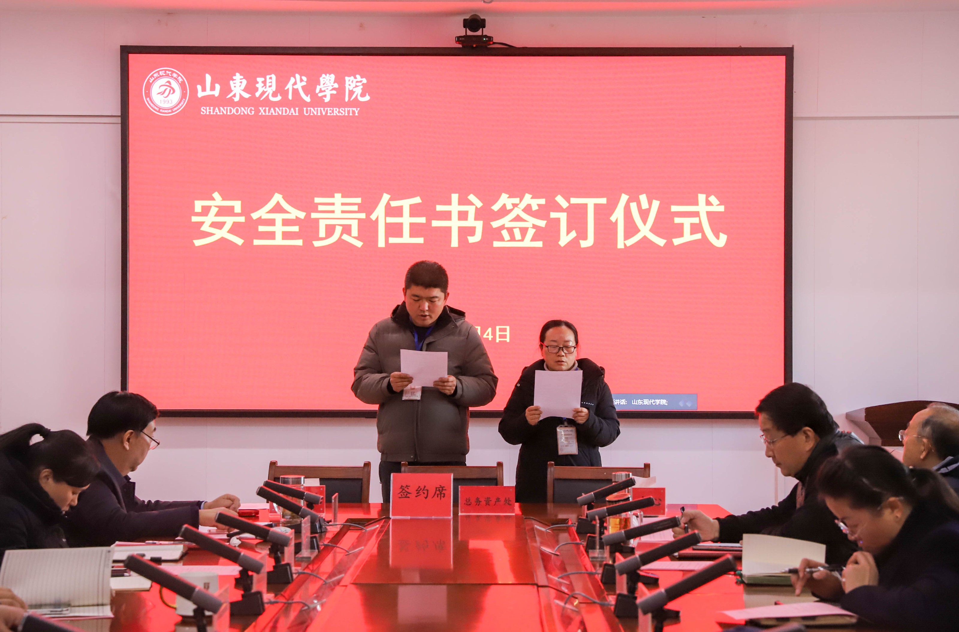 为加强校园安全管理,明确各岗位的安全职责,共同营造安全、和谐的校园环境,12月4日,学校举行安全责任书签订仪式,执行校长朱松涛、常务副校长姜同松、副校长解银苹,各教学单位、职能部门负责人参加会议,党委副书记、副校长帅相志主持签订仪式。