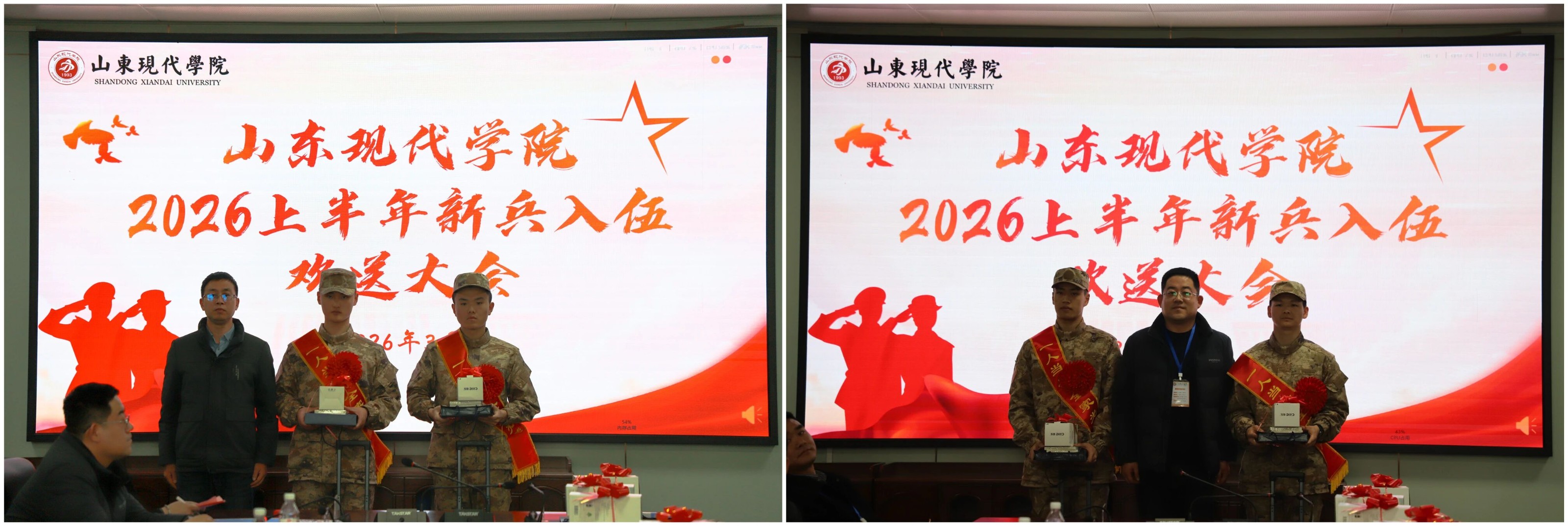 青春披戎装,热血赴军营。近期,我校在图书馆315室举办2026上半年新兵入伍欢送大会。常务副校长姜同松,学生处(征兵工作站)、各二级学院负责人与辅导员老师、家长代表齐聚一堂,共同为13名即将踏上军旅征程的现代学子送行。